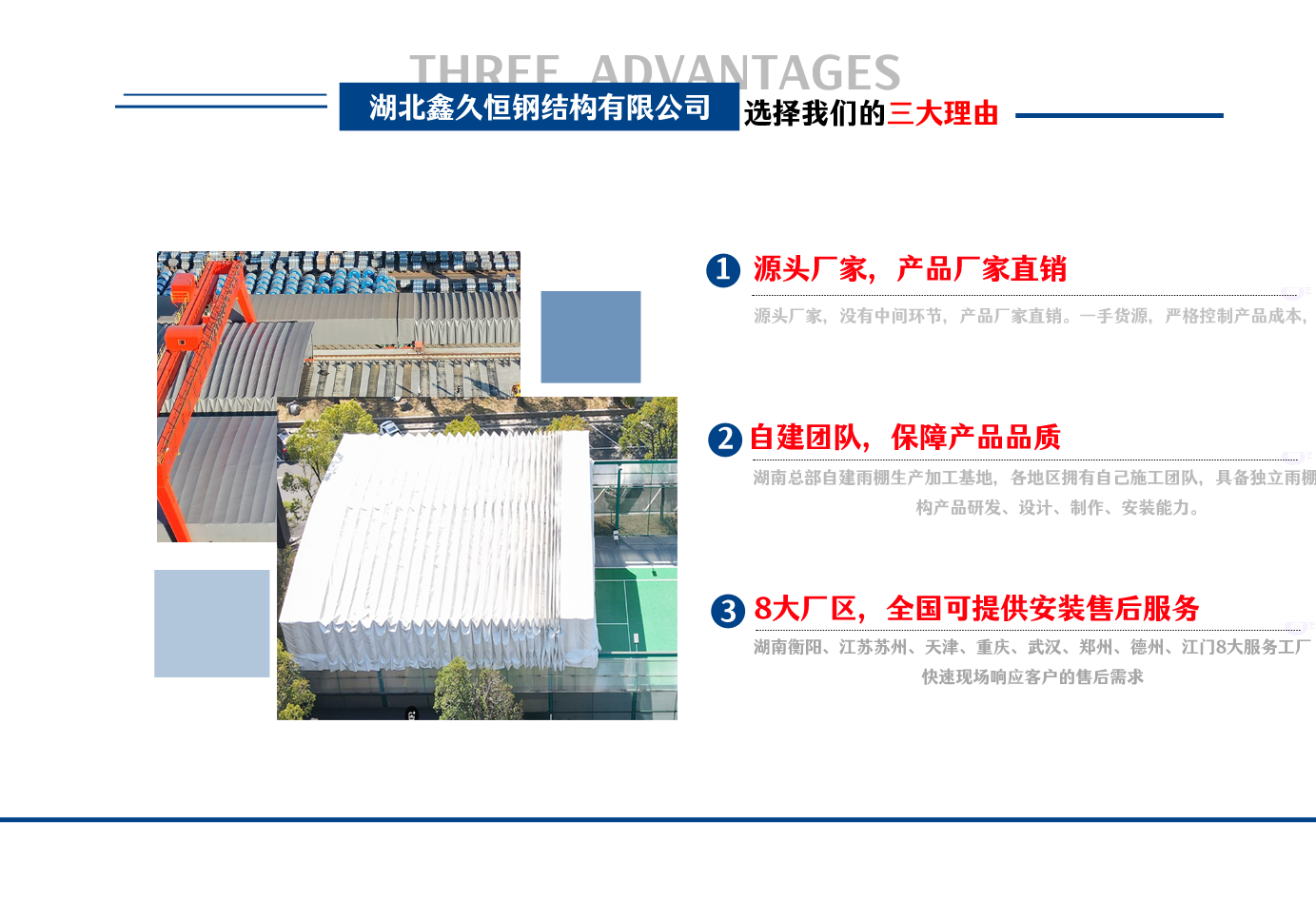 湖北鑫久恒鋼結構有限公司是一家電動雨棚、膜結構車棚研發,生產銷售,施工安裝于一體的專業鋼結構科技公司,主要產品有伸縮雨棚,電動雨棚,膜結構車棚等。 湖南地區職員目前有80多人,占地面積20000平方米,廠房面積15600平方米,配備先進的生產流水線,使每件品質產品的堅實基礎?! 」驹谔K州、天津、重慶、武漢、德州、烏魯木齊、江門均設有服務工廠,總人員共300多人,擁有專業的技術團隊,配備先進的設備和流水線生產,產能高,貨源充足,發貨速度快,服務區域廣?! ∫苿由炜s棚適用于通道臨時倉儲、戶外運動遮陽、污水池遮蓋、能源交通、熱力化工、礦山、船舶制造及市政建設、物流、碼頭等領域的構件制作加工,成品半成品存放、倉庫、野外儀器設備操作用房等。尤其是對工廠發貨、倉儲臨時遮雨防嗮,梅雨期較長、建設周期較短的工程施工等特別適用。還可根據用戶需求量身定制、適合企業所需不同款式的產品。 我公司堅持“誠信社會為本,客戶滿意為榮”的經營理念,做到質量把控,嚴格管理,精益求精,恪守承諾。使鑫久恒逐步走向成熟,其系統化、專業化日趨完善。以專業的技術、科學的管理,更高的產品質量,優良的企業信譽,真誠的客戶服務,靈活多樣的經營方式和務實創新的企業精神愿與社會各界攜手合作,為推動智能鋼結構建筑事業的發展而不斷努力。...